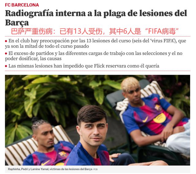 “FIFA病毒”是导致巴萨伤病不断的原因。《世界体育报》统计,亚马尔、奥尔莫、德容、莱万、费兰-托雷斯、特尔施特根6人,都是在国家队期间受伤。这也是巴萨对西班牙足协、荷兰足协感到不满的重要原因:明知球员疲劳有伤,还强行让他们出场,导致伤势加重。